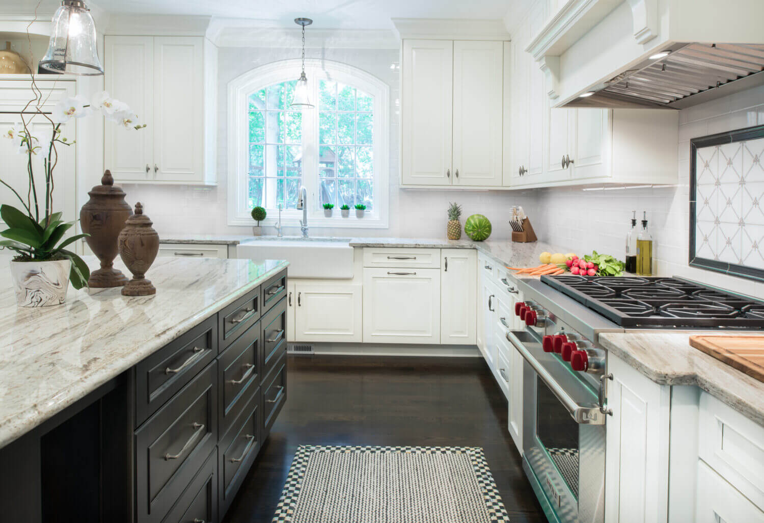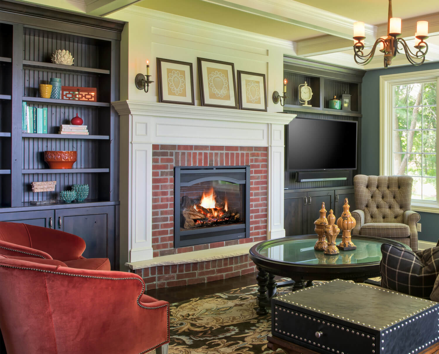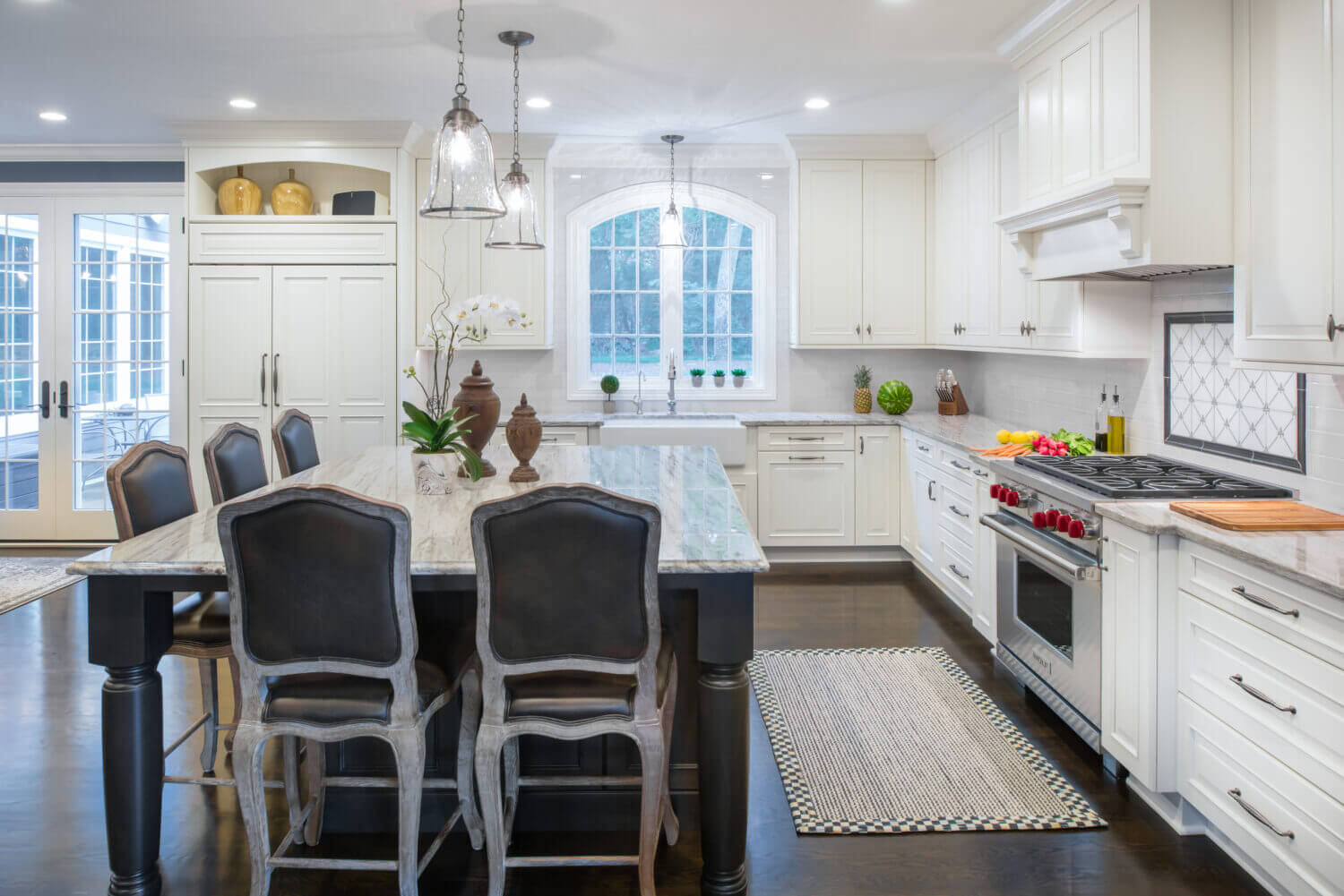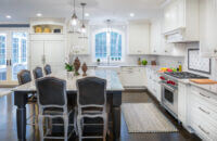 This two-tone kitchen & living room remodel incorporates Dura Supreme’s “White” painted cabinetry in our Chapel Hill Classic door style (primary kitchen cabinets and fireplace mantel) and “Onyx” stain on Knotty Alder with our Chapel Hill Panel door style (for the kitchen island, entertainment center, and wet bar cabinets).