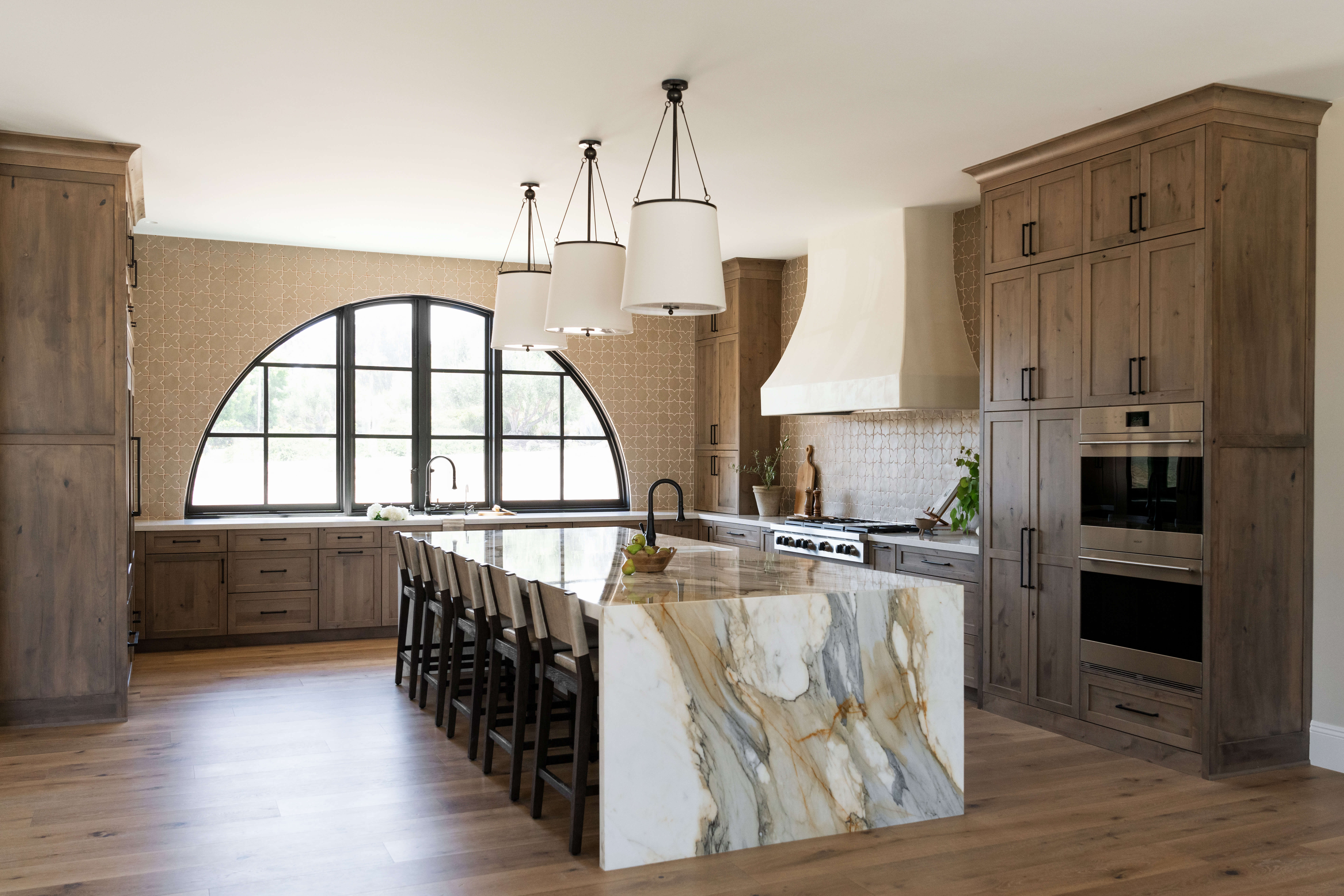 Another stunning project from Honeycomb Home Design is shown below. Knotty Alder cabinets with Cashew stain applied to the Carson door was used for a soft, rustic feel on the perimeter cabinets. Everything about this project feels raw and natural, including the quartzite waterfall countertop. And check out the arched window letting all the outdoor light in!