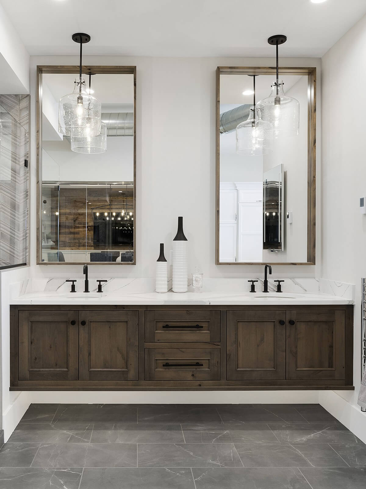The below contemporary project features not only two faucets, but two different door styles as well. The contemporary styling of our Moda-Vertical door in Cherry with Butternut stain was mixed with the Dempsey door in Black paint. Add Aluminum Frame Door #1 in matte black Onyx and you get a striking contrast between the materials.
