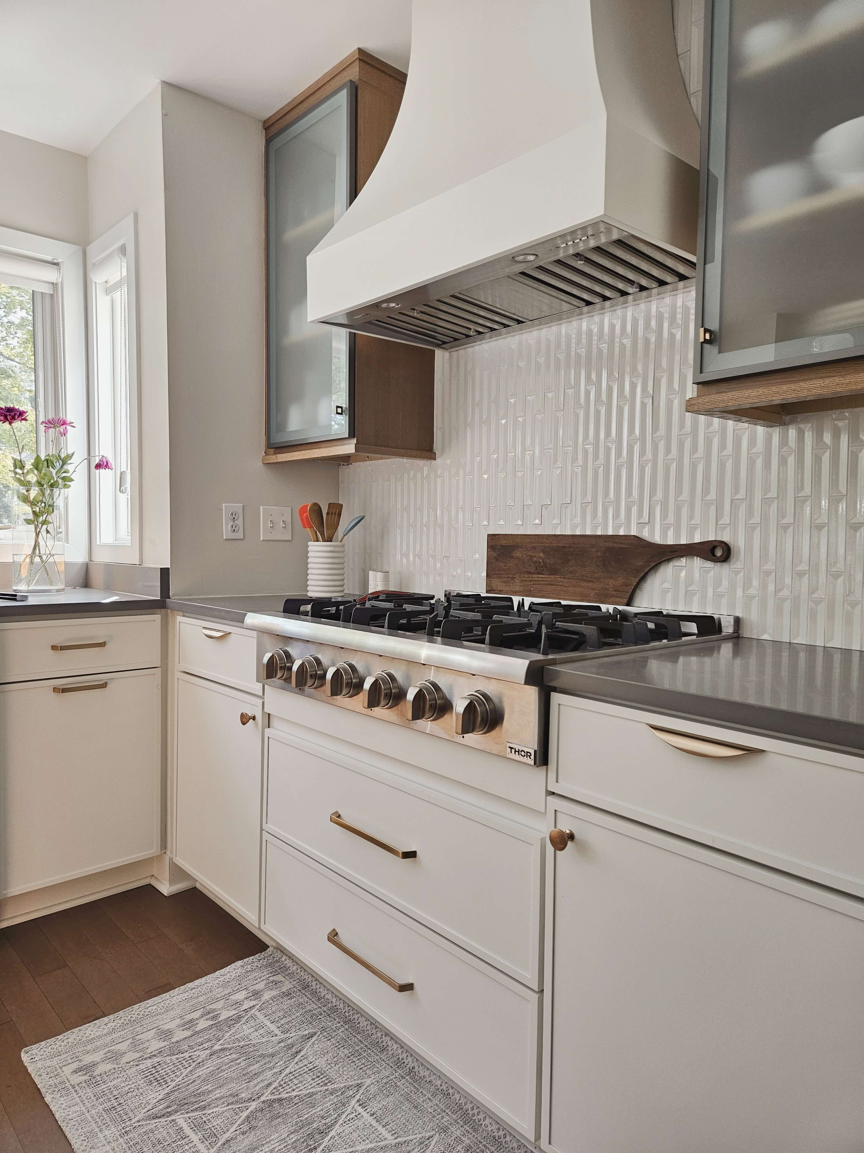 Aluminum Frame Style #4 in the Graphite finish with Satin Glass adds a soft contrast to this kitchen featuring the Reese door style with Dove paint and Quarter-Sawn White Oak accents with Sesame stain.