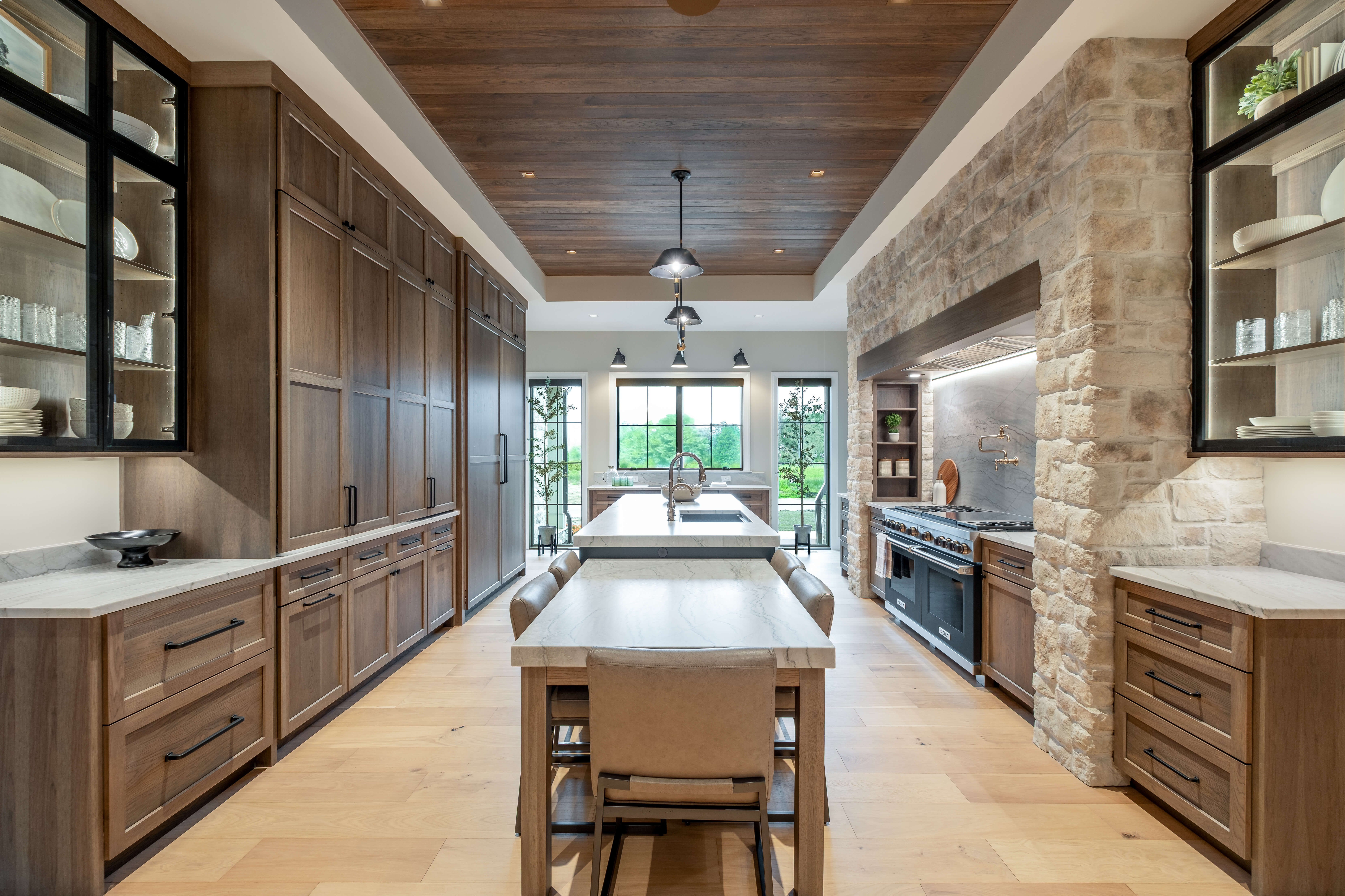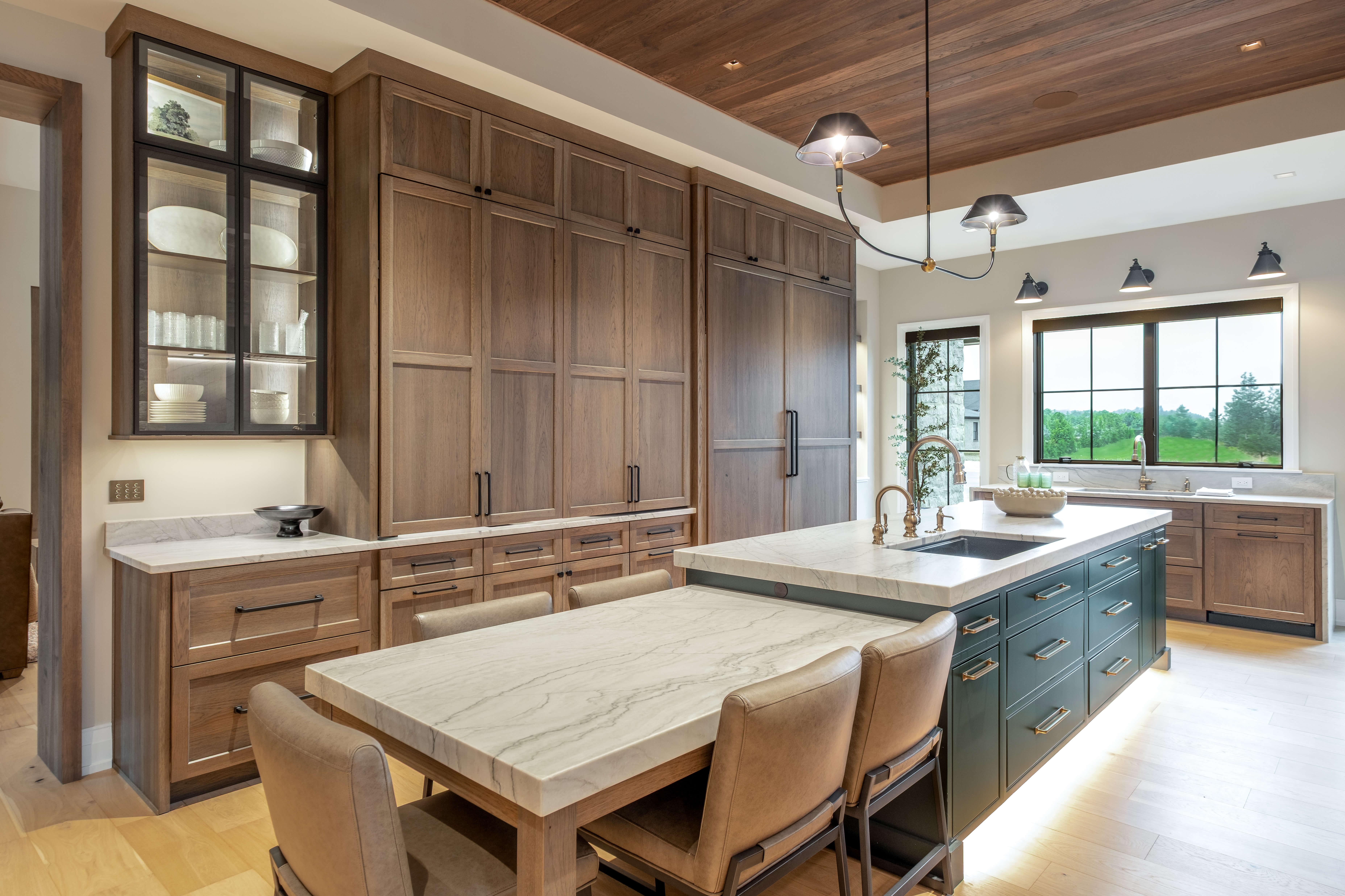 Double arched doorways lead into the back kitchen of this project, featuring the Hudson shaker door in both Quarter-Sawn White Oak with Cashew stain and Dove paint.