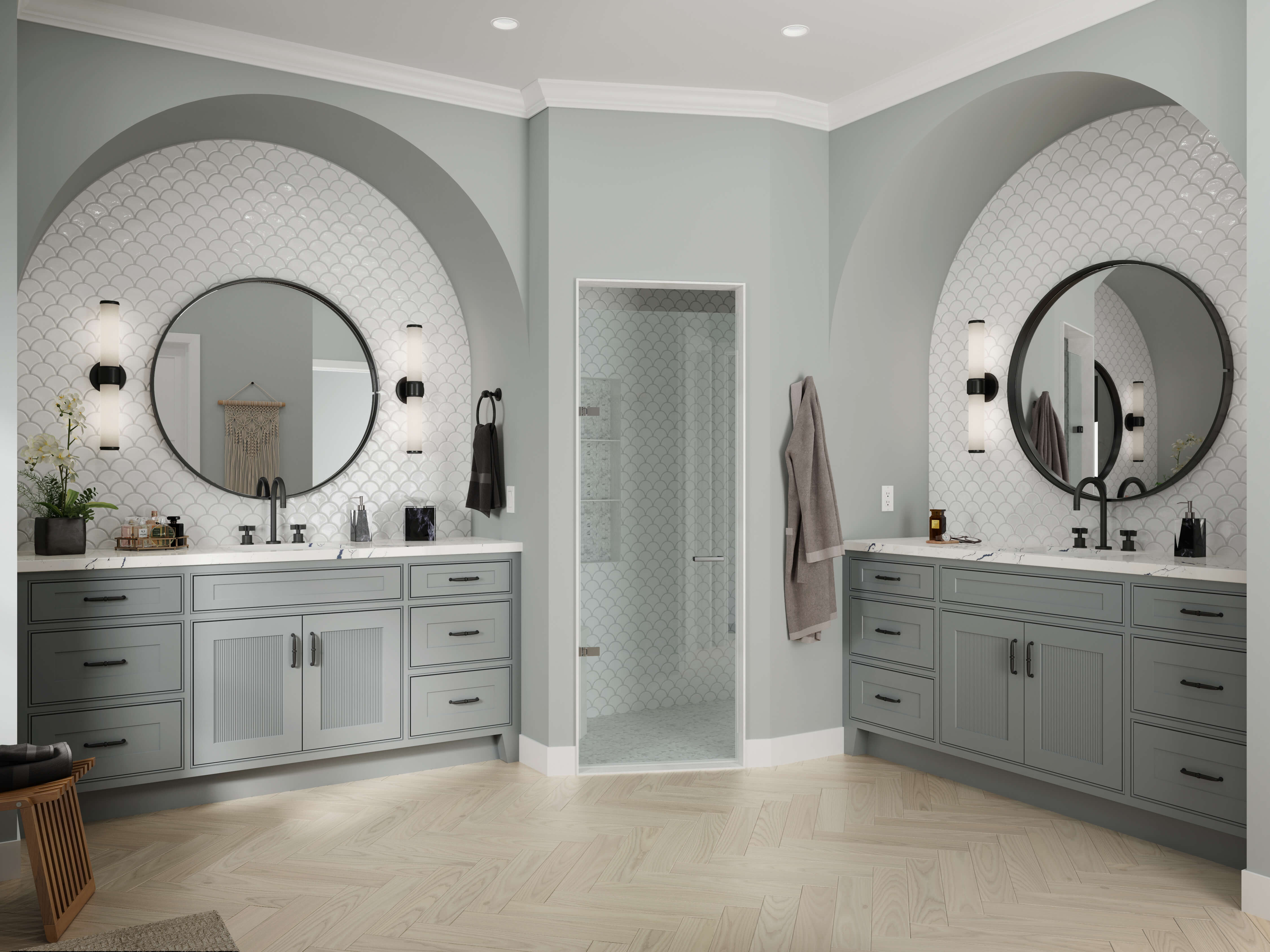 The below primary bathroom features arched alcoves that contain the vanities and free-standing tub. The cabinetry showcases our Parker Beaded Inset door in Software paint, with reeded center panels on the doors for added texture.