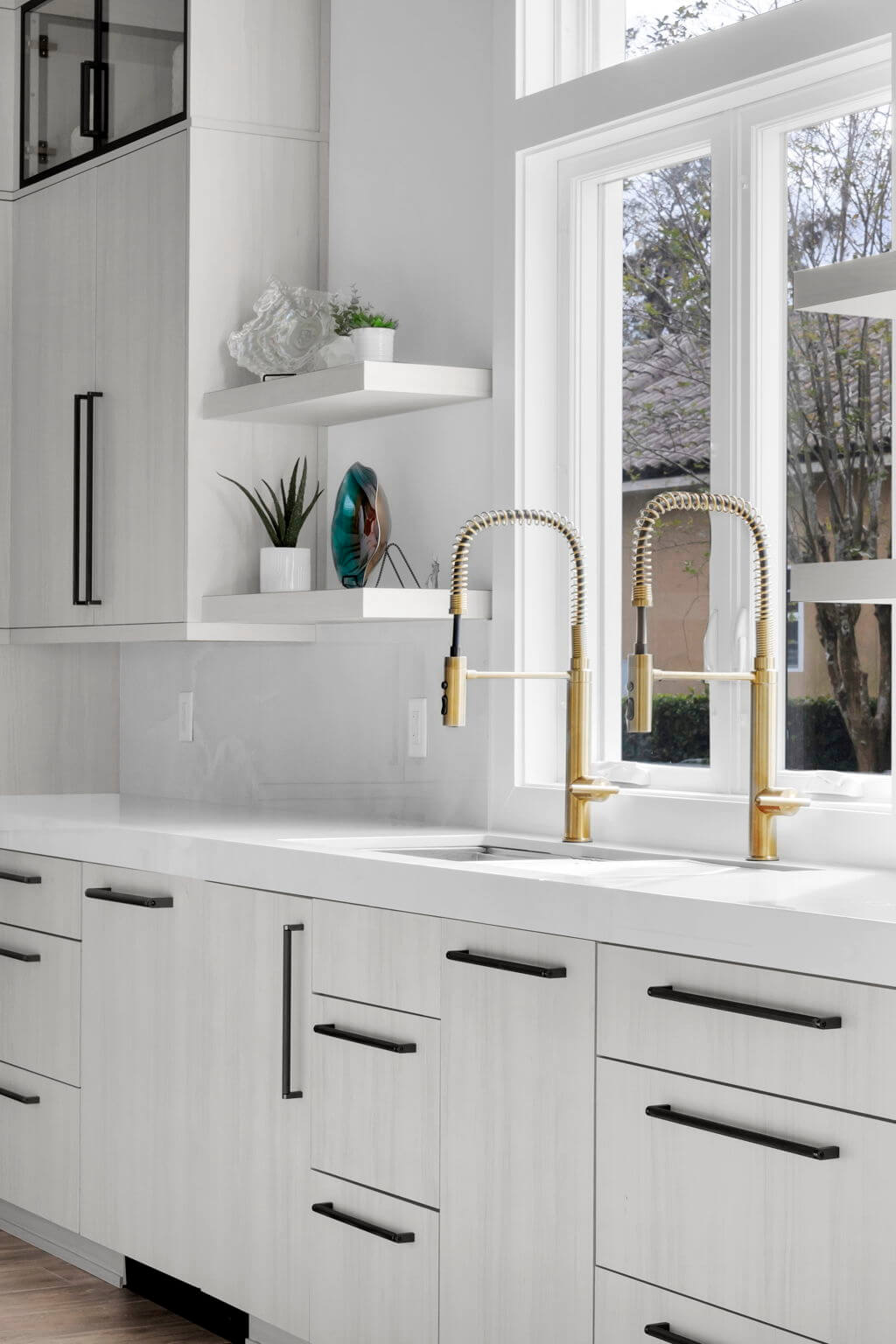 Beautiful gold double faucets are highlighted in this kitchen using our Alpine door style in White Cypress Laminate with black matte Onyx, Style 1 Aluminum Frame Door.