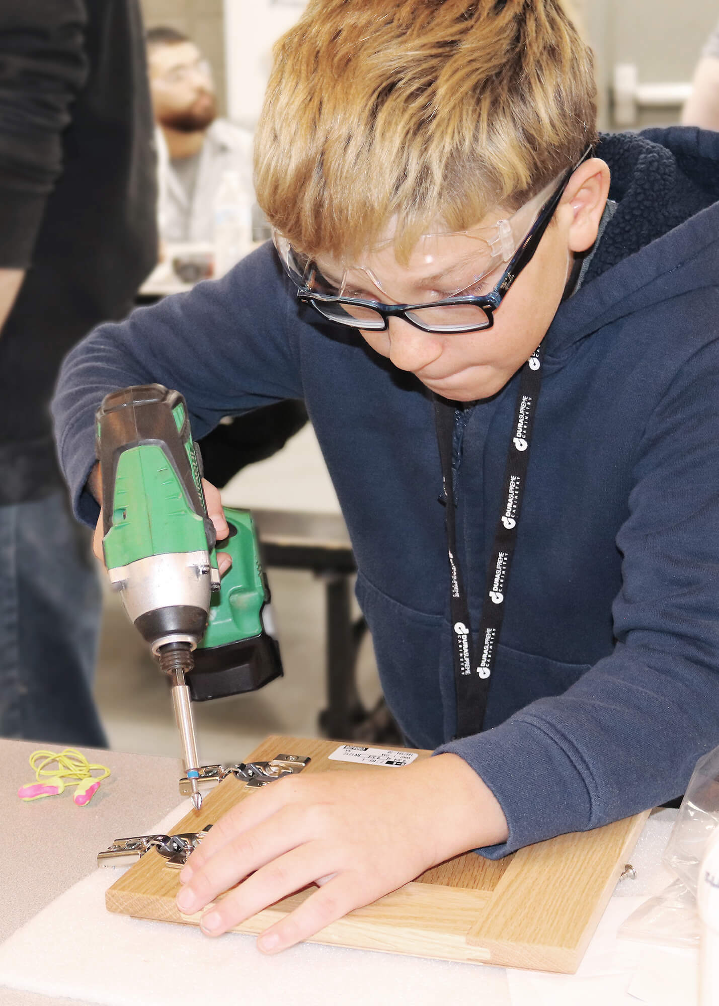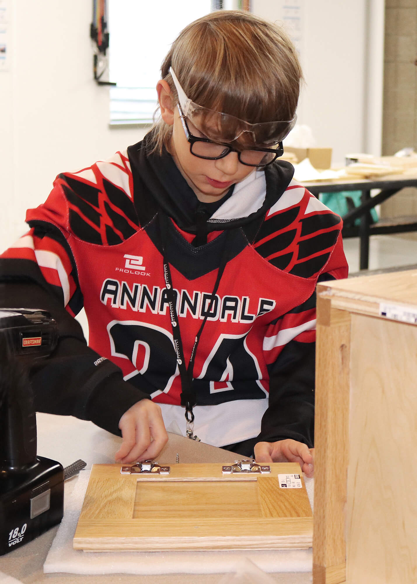 After the tour, the class meets in the lunch room for our Build-A-Cabinet project! With assistance from the managers and our volunteer supervisors as they get geared up with the proper safety equipment, our Environmental Health and Safety Manager, Tom Christensen, gives a presentation on safety and demonstrate the how to properly and responsibly use the tools they will need to make their cabinet. Then everyone dives into this fun hands-on activity.