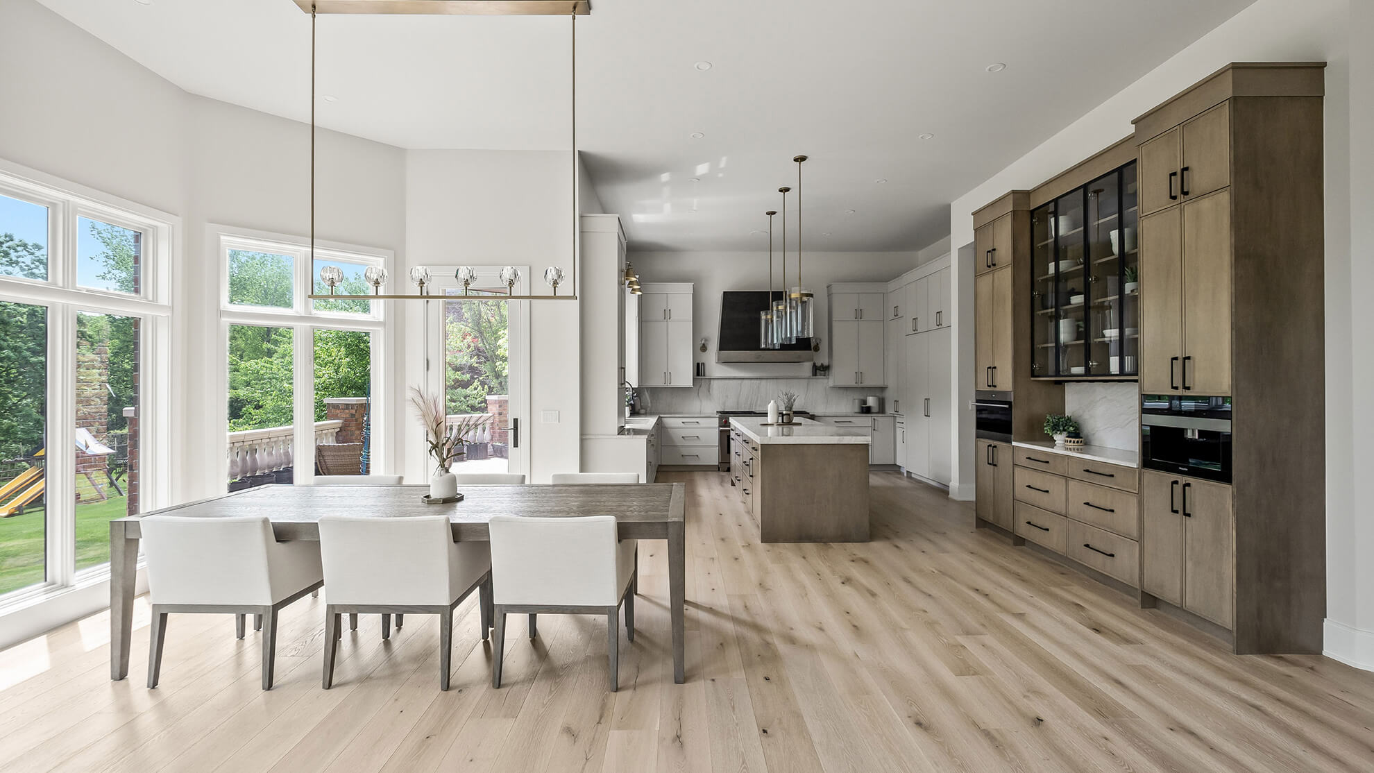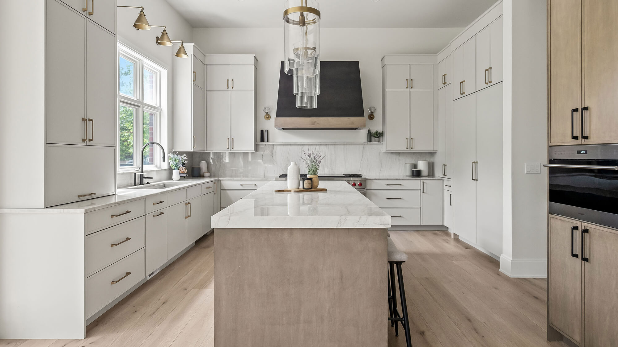 In the heart of the home, we designed a kitchen that feels effortlessly balanced. A soft, natural wood stain on the kitchen island and built-in hutch adds warmth and grounding, while light-painted cabinetry around the perimeter keeps the space bright and airy.
