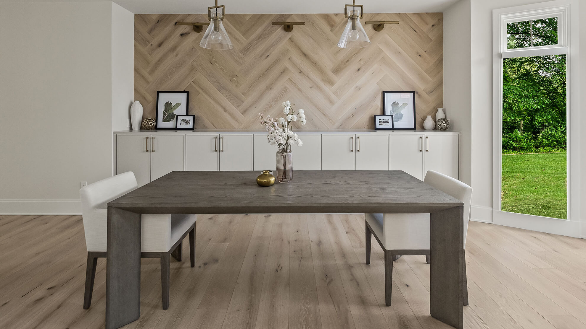 Upstairs, the dining room balances elegance with simplicity. A herringbone feature wall adds subtle texture, while light-toned cabinetry keeps things cohesive with the kitchen just steps away.