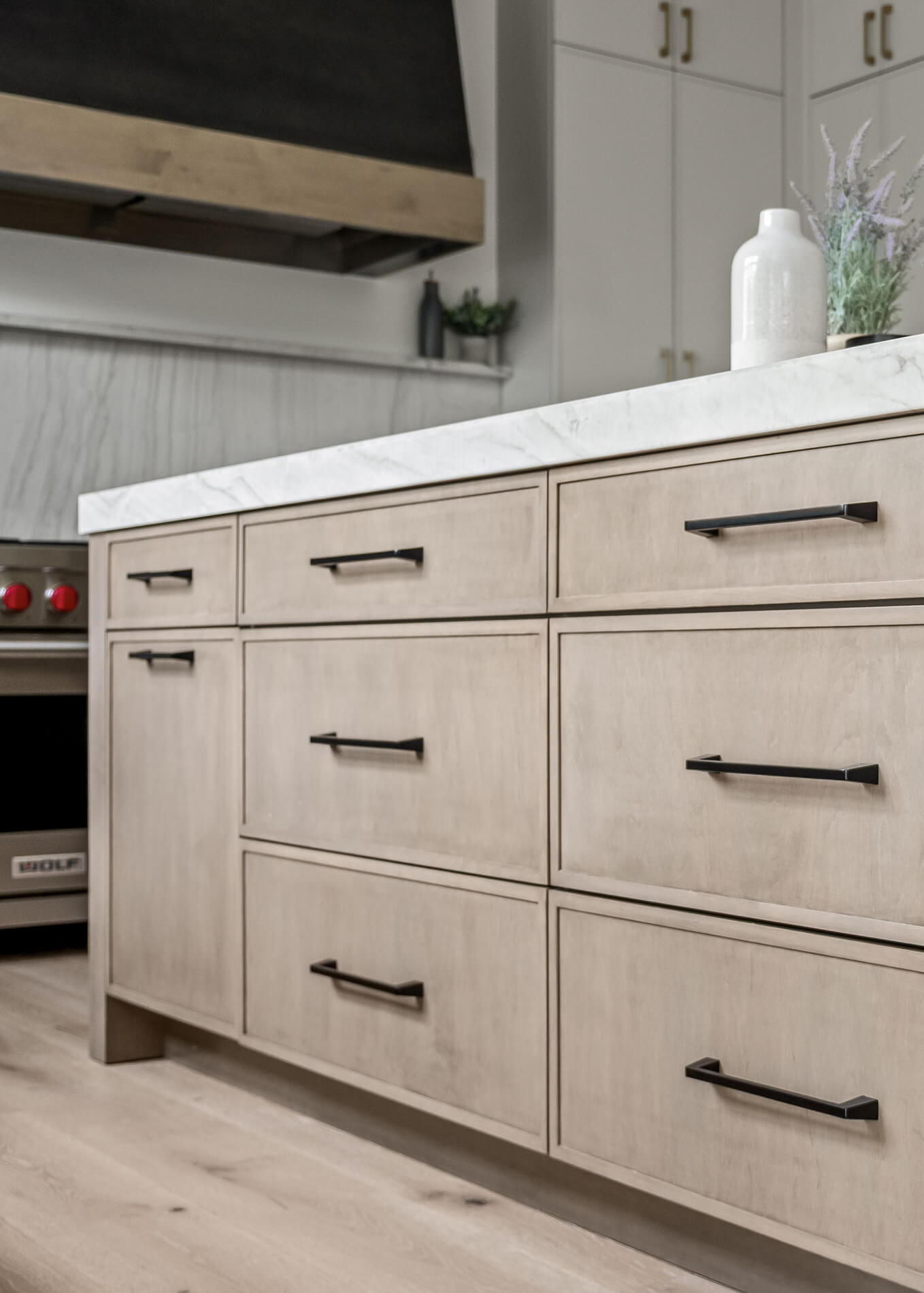 We chose the Reese door style in the “Canvas” paint, echoing the kitchen while complementing the light herringbone accent wall.