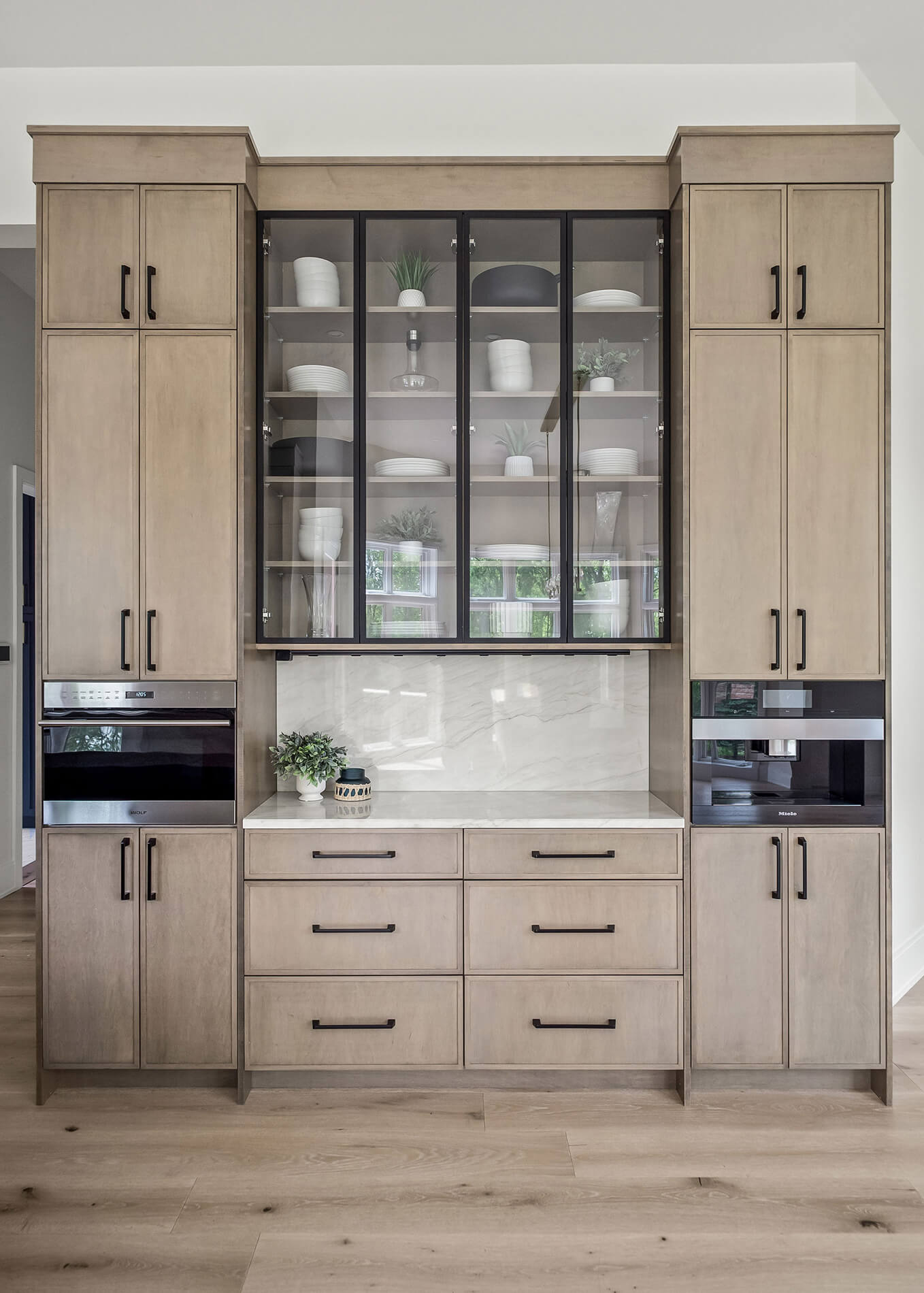 Just downstairs, we created a second kitchen designed for entertaining. With clean-lined Quarter-Sawn White Oak cabinetry, integrated appliances, and a palette that feels both modern and relaxed, it is the perfect place for guests to gather.