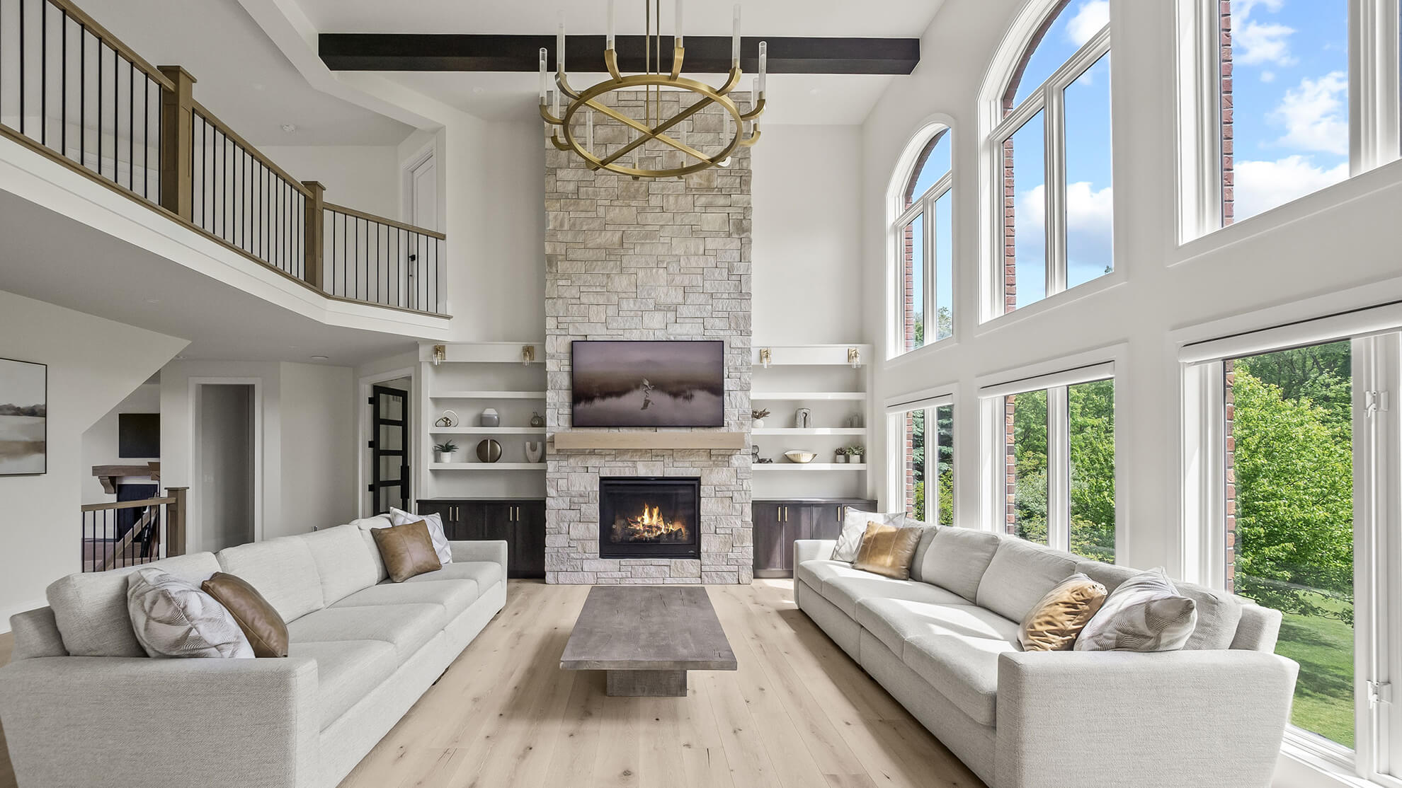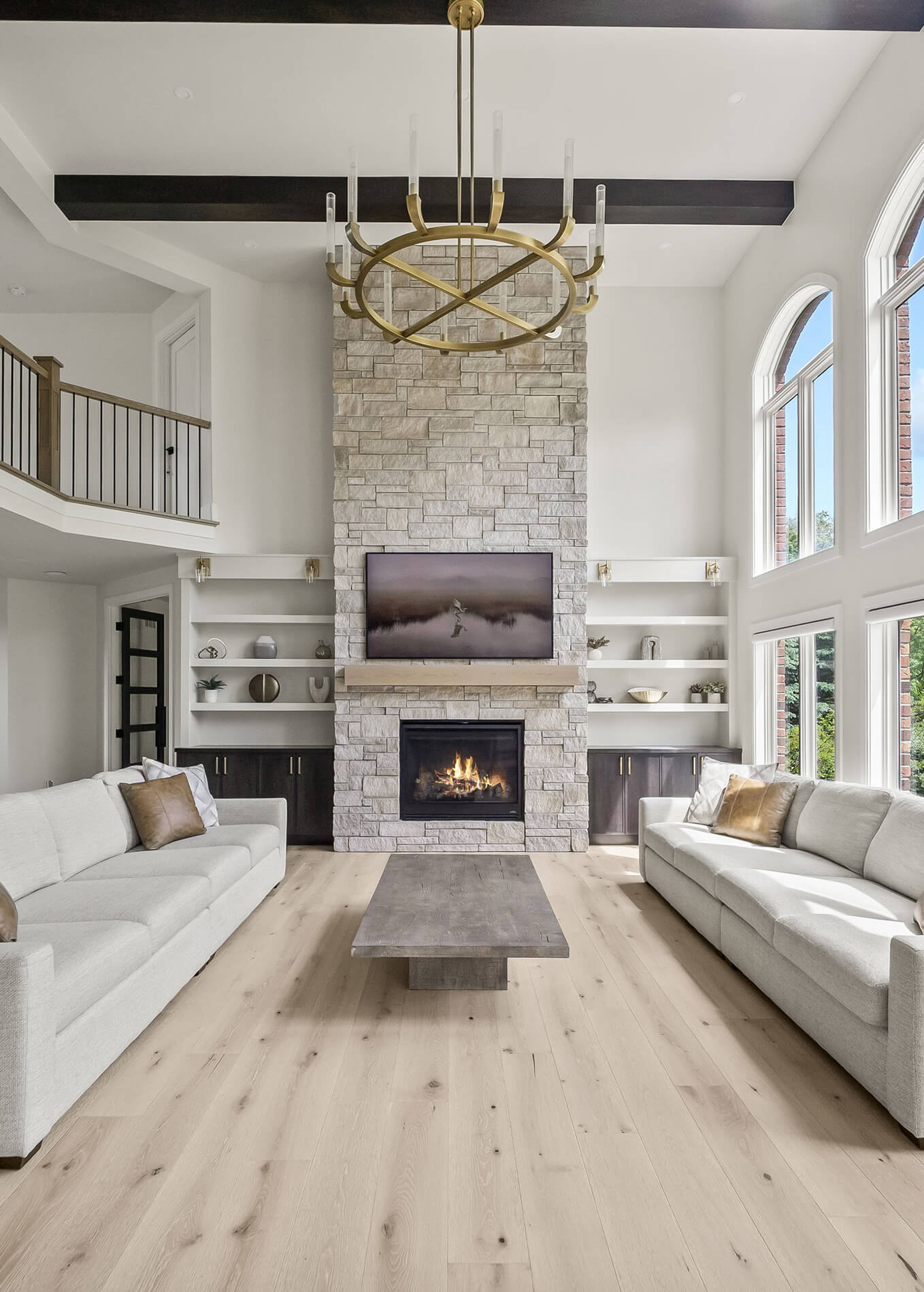 In the family room, we carried the “Onyx” stained finish on Maple from the kitchen wood hood to the base cabinetry with the Parker door style, flanking the fireplace, and paired it with “Canvas” painted shelves. The stone fireplace surround echoed the kitchen’s quartz tones, tying the two spaces together beautifully.