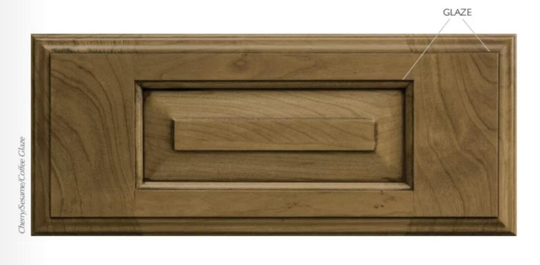 A glaze is a semi-transparent color that is applied over the stain finish for added depth and dimension. Along with profiles and corners, the glaze highlights and accentuates the carved details of the cabinet door. A glaze finish is an artistic, hand-applied cabinet finish technique that will exhibit subtle and unique variations.