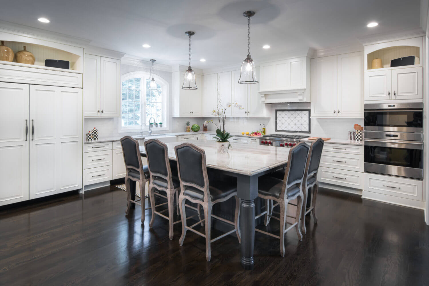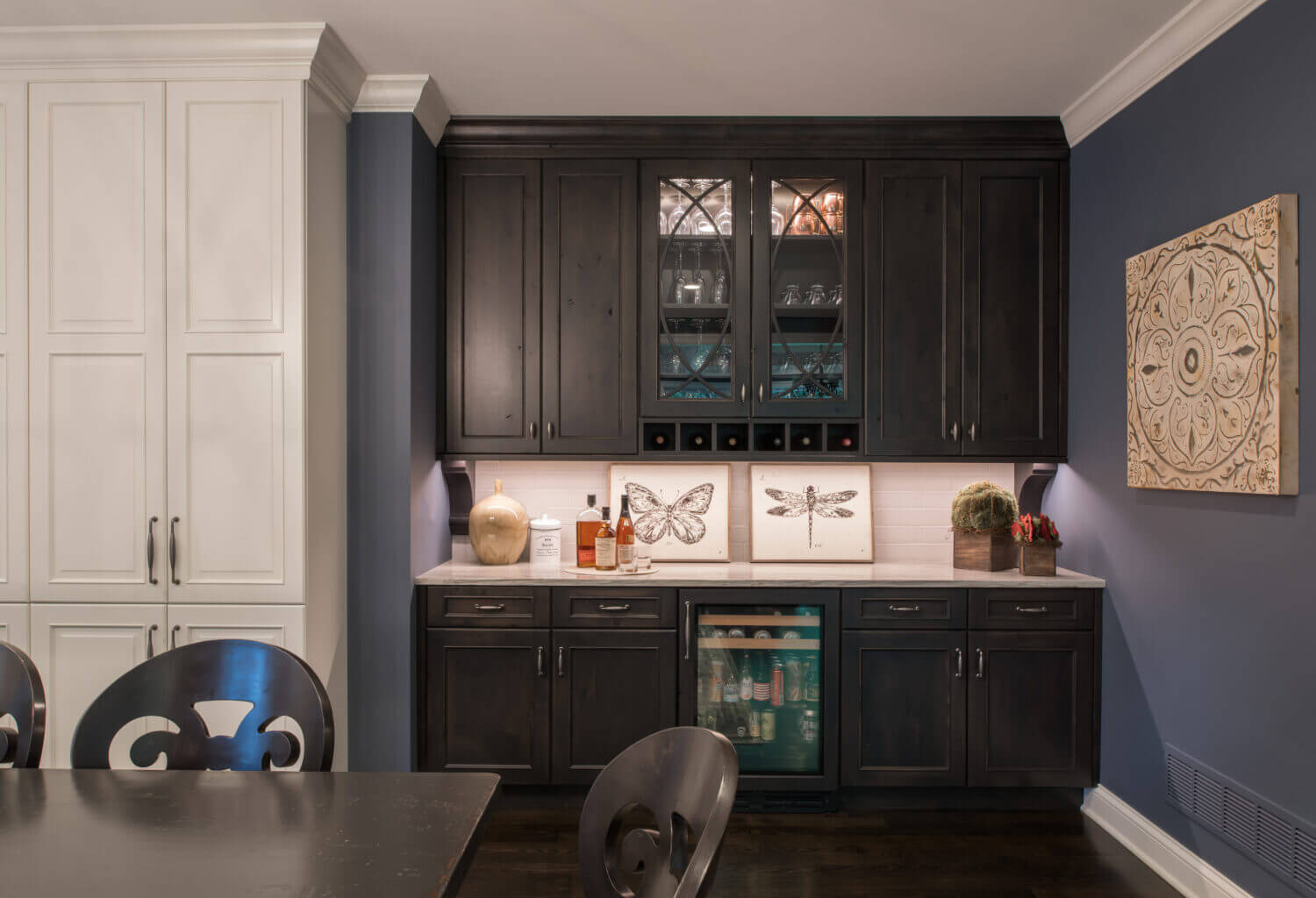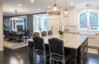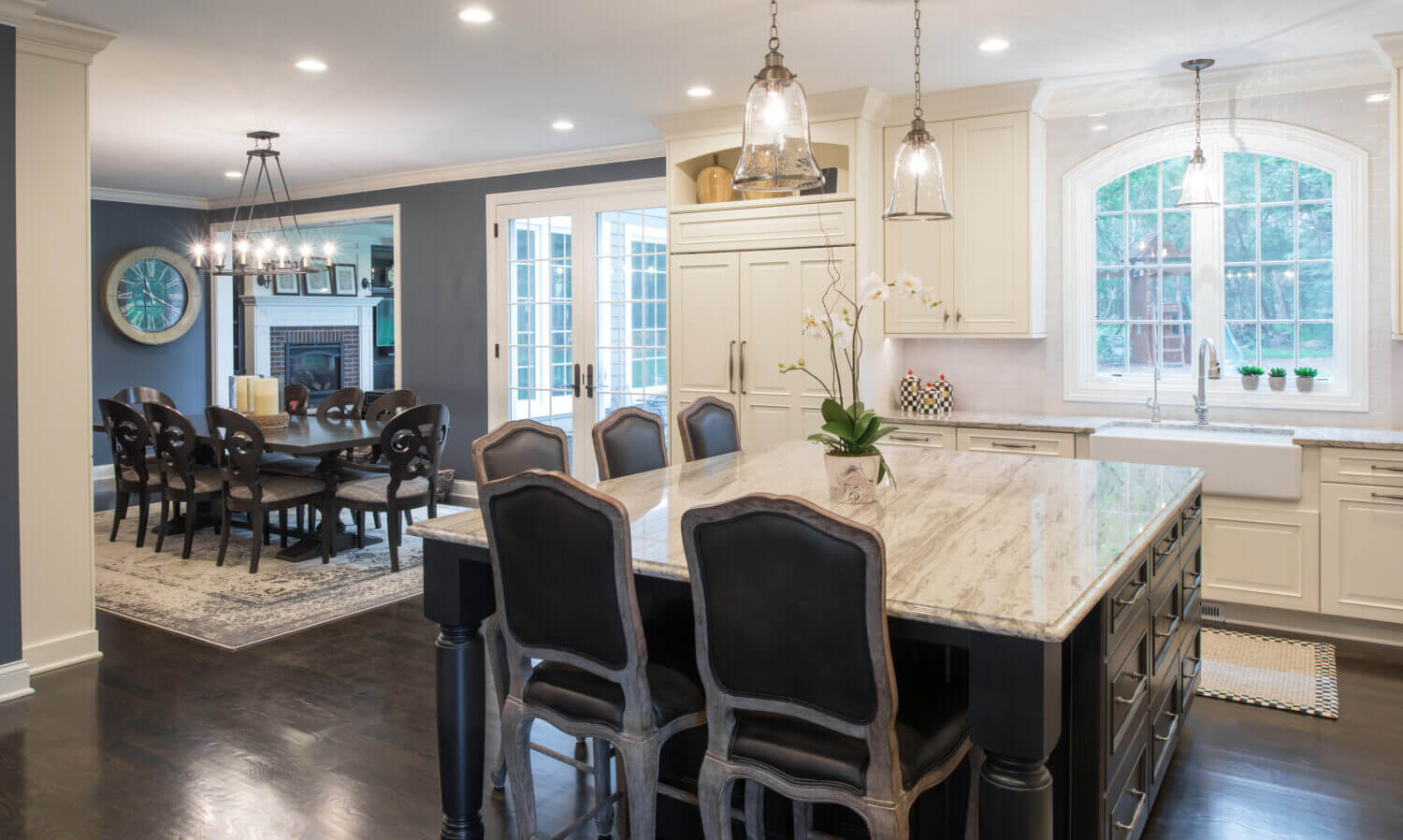 This two-tone kitchen & living room remodel incorporates Dura Supreme’s “White” painted cabinetry in our Chapel Hill Classic door style (primary kitchen cabinets and fireplace mantel) and “Onyx” stain on Knotty Alder with our Chapel Hill Panel door style (for the kitchen island, entertainment center, and wet bar cabinets).