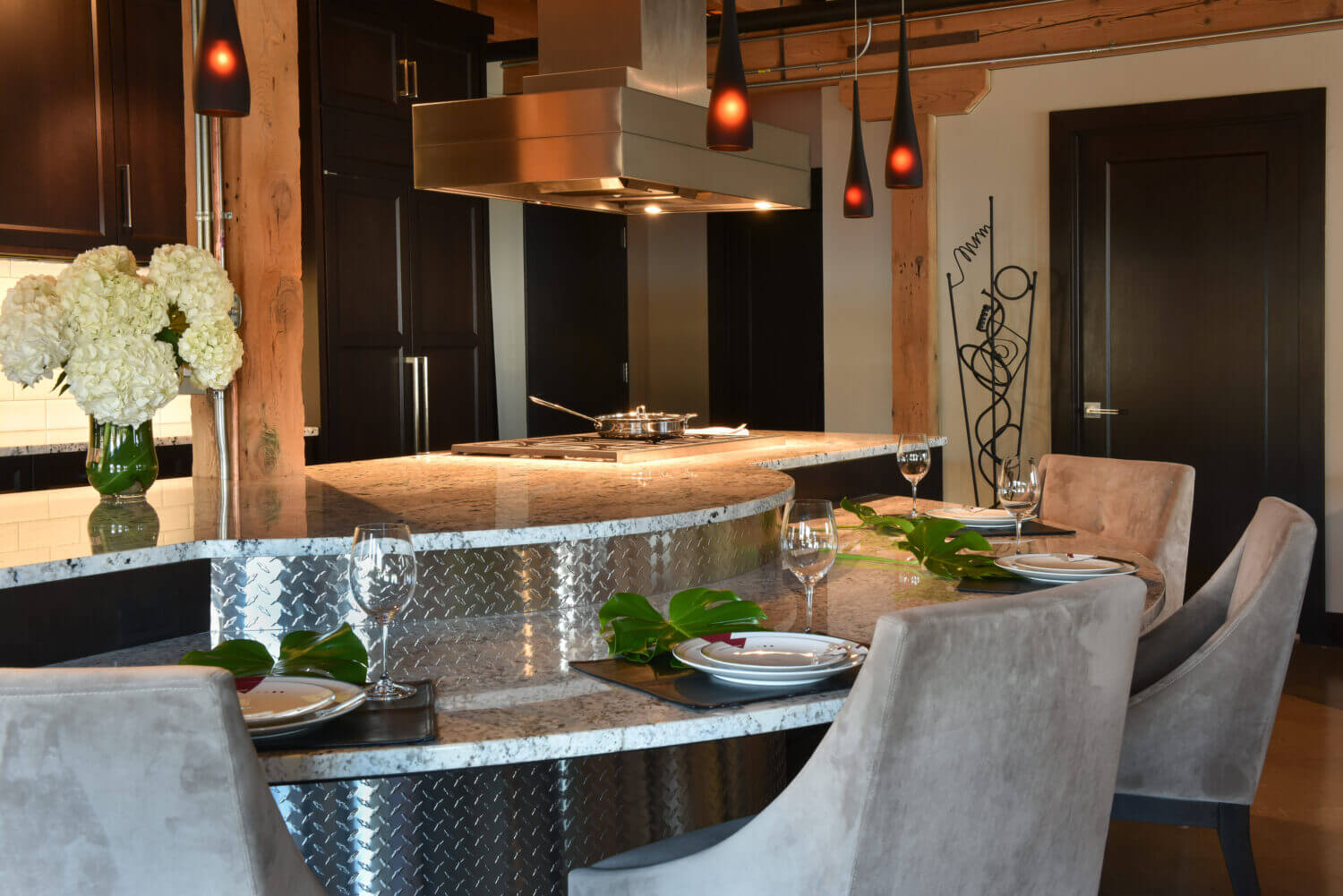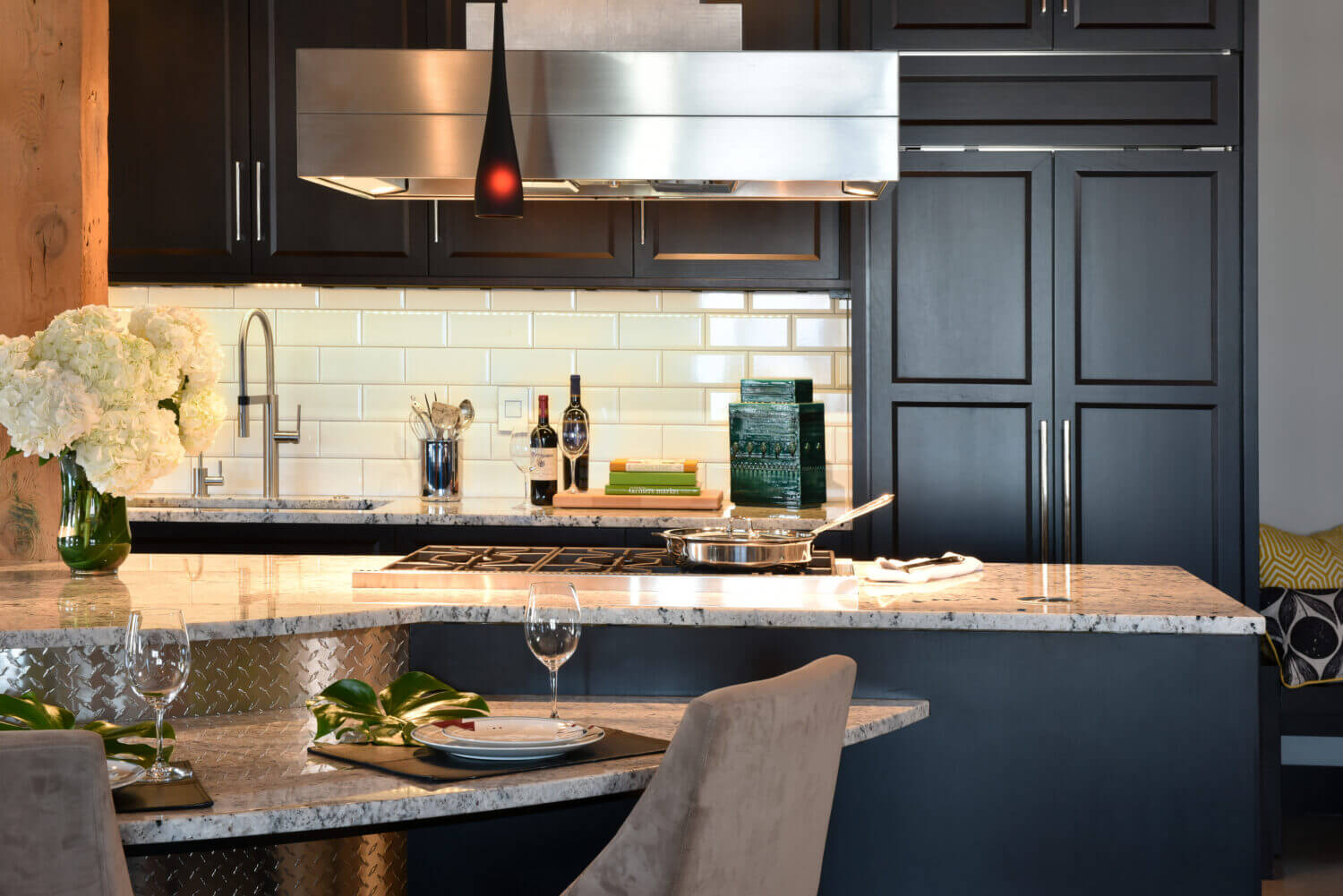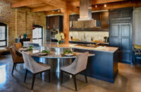 The unique architecture of the historic warehouse converted into an urban home sets the stage for this industrial chic kitchen design. Because of the unique architecture, the designer carefully planned the kitchen layout and cabinets to work fluidly with the existing structural elements, beams, and rooftop access for venting.